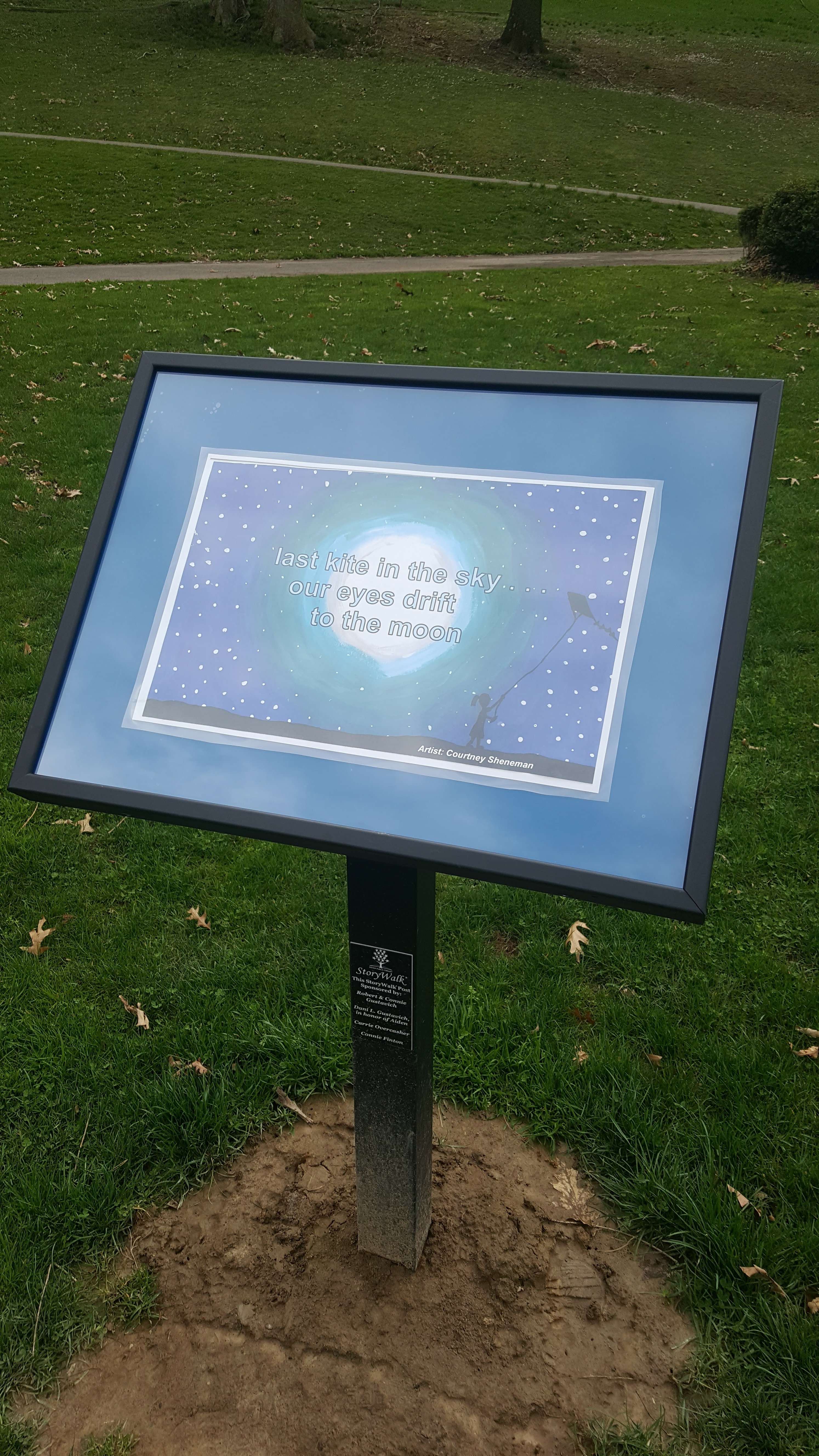 Last year, our local library installed a StoryWalk around the pond at our city park. Essentially, a StoryWalk consists of sixteen permanent signposts along an outdoor path. Each post features a two-page spread of a children’s picture book, inviting walkers to a read-as-you-go experience. In our case, one lap around the pond and you’ve read a whole book. The signposts are designed so they can be opened and allow the material inside to be interchanged. In this way, visitors to the path enjoy a new book every month.