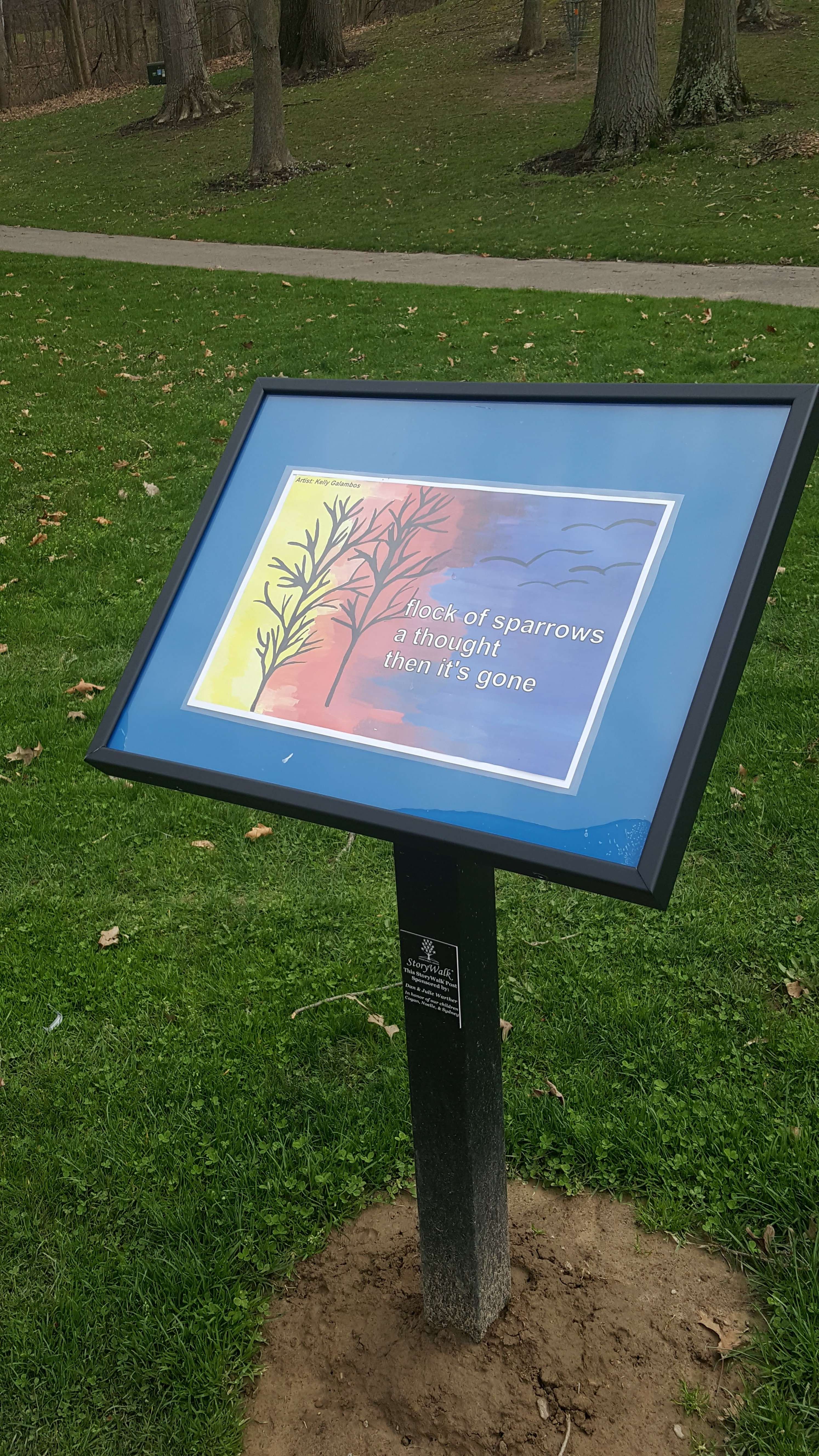 So Dani sent the poems to the high school art teachers who initiated a small art contest among four of their classes, including courses in painting, digital photography and mixed media. The teachers led a short discussion of haiku and passed out copies of the sixteen poems. As a class, they brainstormed the mood of each poem and what visual imagery might be appropriate to convey the feeling of the selection. Students who wished to participate could choose any of the poems to illustrate. The art teachers would then select one piece of art for each poem and the winning artwork would be displayed with the poems on the StoryWalk. After about a week and a half, nearly ninety works were submitted. The results were thoughtful portrayals. It was obvious the students took some time with the poems. An artists’ reception was held at the park so the public could meet the students and view their work. You could see the pride as they stood by their respective posts. There was also excitement as I met each artist for the first time and they met the previously faceless writer of the words.